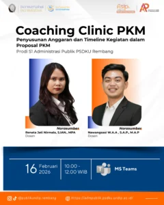 Rembang, 5 Januari 2026 — Program Studi Administrasi Publik PSDKU Rembang, Universitas Diponegoro kembali memperkuat ekosistem akademik dan kreativitas mahasiswa melalui penyelenggaraan Coaching Clinic PKM